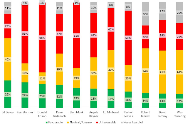 Oddly, a third of Brits genuinely think Jezza would do well as an MP, and we don't even have a majority opining that he would be shit at the job and that it's a fucking joke. Which it probably is, summat of a prank by an idle journo with way too much time on his hands. Unsurprisingly, only Reform voters take Jezza seriously, but that would never work. Like his role models Trump and Putin, Benito Farage tolerates nothing short of absolute devotion, and Jezza has already had harsh words towards him over his total lack of knowledge of the realities of English rural life, of which Jezza himself is of course an expert. Besides, Doncaster North maybe one of Benito's prime targets because of his rabid hatred of Net Zero, but Reform did not even find a candidate to stand there last year. Even gaining control of the City Council at this year's locals does not say they could nick Miliband's seat despite favourable voting intentions in Yorkshire.