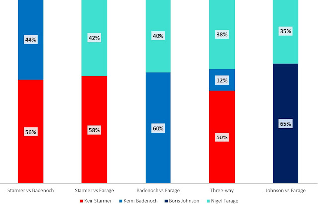 The proverbial and ancestral Preferred Prime Minister polls still find Nigel Farage in the lead and Kemi Badenoch trailing, though she has benefited from a decrease of the "none of these wankers" choice, which is nevertheless still attracting a third to half of Brits, depending on who your preferred pollster is. My caveat here is that such polling does not really prove that we think Farage would be a good Prime Minister. It only says that we think Starmer is a lousy one, and Badenoch is not even worth trying as she is totally shit as Leader of the Opposition. In most polls that offer this three-way option, the Bargain Bin Mussolini's ratings don't even match his party's voting intentions. I can only wonder what the real ratings would be, if the establishment mediatariat stopped acting as Reform UK's press office, and the loopy far-left fuckwitatriat stopped playing the useful idiots of fascism with their constant Starmer-bashing. How much of the influence would remain if we silenced the influencers? Which is not censorship, but just allowing the people to take back control of the way they form their opinions.