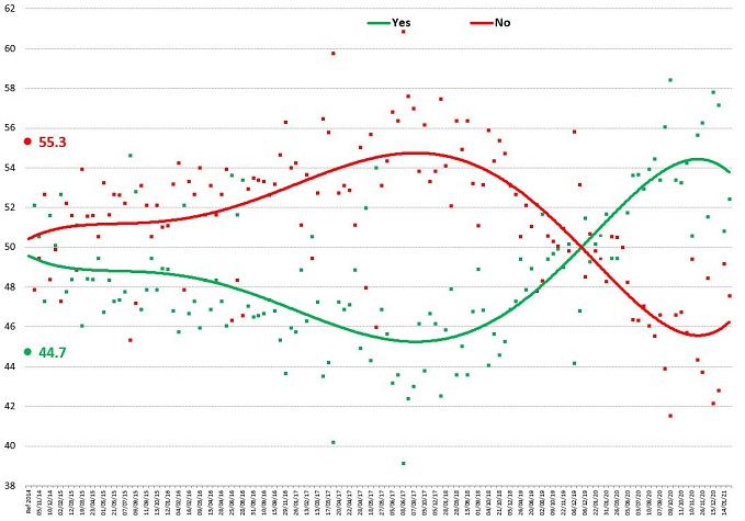 I think that the situation is not as bad as the recent downward trend of the Yes vote would make you believe. First of all, you should not consider just the raw results, bot also how they compare with previous answers to the same question. Here the Survation and SavantaComres polls show no change from the previous surveys by the same firms, that were both fielded in December. Only the Panelbase poll is a bit worrying as it shows the Yes lead down by 6% on their previous poll conducted in November. But this earlier poll was one of those showing an unexpectedly high level of support for Yes, so part of the explanation might just be random differences in sampling. Or not. Then the reassuring part is that the weighted average of the three January polls is not significantly different from what we had the last time I wrote about this in November, as the chart further down shows. Just notice that undecideds still make up about 10% of the electorate, and potentially still hold the key to success. As I have said multiple times already, the path to victory is converting undecideds, and I'm delighted to see The National has now endorsed this strategy and launched a new campaign that looks quite successful so far. Let's just hope this will not fall flat after the SNP announced their Eleven Points Roadmap, that quite muddied the waters by being released after hearings were concluded in Martin Keatings's People's Action On Section 30, which has now been sent to the Inner House of the Court of Session. It was quite puzzling to see Pete Wishart claiming the first ruling was a final blow for the case, when it obviously was not, as it was not dismissed on its merits but pretty much on technicalities. But Pipe'n'Slippers Pete had probably not read the SNP's document in full, as its Article 10 clearly states that court action to circumvent Section 30 will be on the table after Holyrood passes a Referendum Bill. Always fun to see Wishy making an arse of himself trying to out-sturgeon Sturgeon on gradualism. But then who still really cares about what Pete has to say?