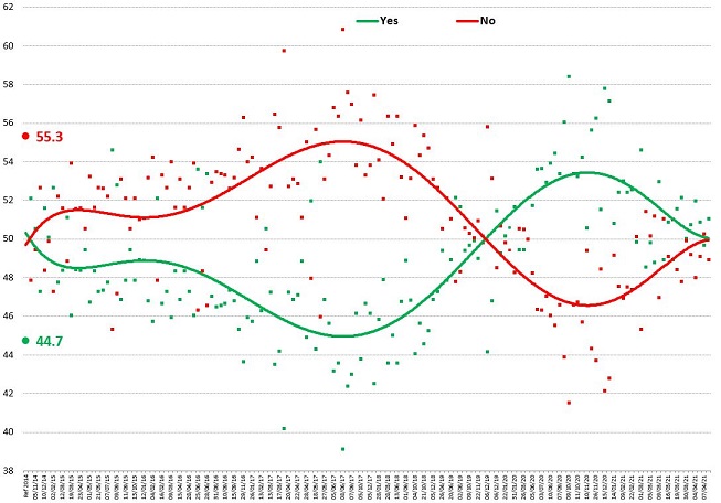 Polls on the second Independence referendum have been quite disappointing this year. An uninterrupted streak of 23 Yes leads was brutally interrupted in early February. Then we had a sequence of swings form No to Yes to No until mid-March. There weren't enough polls showing No in the lead for a long enough period of time to drag the trendlines to a sustained No majority. But that does not make them look really better. The polls fielded from mid-March to mid-April remain quite worrying, with Yes very far from the double-digit leads it enjoyed in every other poll not so long ago. And the weighted average of the most recent batch of polls has been flatlining at aboot 51-49 for Yes for some weeks now. Uncomfortably close, innit? But we can only hope that the Holyrood campaign will boost the Yes vote. First Nicola Sturgeon and Patrick Harvie are like pig and blanket when discussing it during a debate, and ticking all the right boxes to get the message through. You can doubt their actual commitment to Independence, and I do, but you can hardly find fault with the current talking points. Oor Doogie Ross and Wee Wullie Rennie are also of great help, though unwillingly. Doogie only makes an arse of himself every time the issue comes up. Wullie was successfully baited by Nicola into admitting that all his significant manifesto pledges could only be implemented with Westminster's approval, thusly making the case for Independence against his own will. And Labour are obviously moving towards endorsing the principle of a second referendum, if not Independence itself. All Anas Sarwar has to do is acknowledge that Double-Devo-Max Federalism might be the sunlit uplands in some alternate reality, but will definitely never work in this one. Of course, we also need a strong Yes movement from the grassroots, ready and willing to campaign tirelessly whatever the result of the election and the shortcomings of the next Scottish Government. In the end, it's aw up tae us.