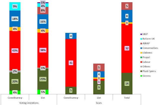 But I think Mark Drakeford is doing himself and Welsh Labour no favour by endorsing a Scottish-style self-identification reform, that is no more popular in Wales than it is in Scotland. Fortunately, the legislative competence to do so is not devolved in Wales, and the English Government has no intention of giving it to them. There is the weeest hint of that is YouGov's latest Full Welsh poll, fielded after the Scottish gender fiasco, and planetary reactions to it, made headlines all through the Alpha Quadrant. It show a 2% swing from Labour to the Conservatives in Westminster voting intentions, since YouGov's previous Full Welsh in late November. But hardly anything significant in Senedd voting intentions, so the jury is still out for now. Obviously Labour remain the dominant party West of Offa's Dyke, and by double-digit margins on all votes. Then there is competition between the Conservatives and Plaid Cymru for second place. The Conservatives get it in Westminster, though only in votes and not in seats, but Plaid Cymru get it quite easily in Senedd, as the seat projection from the YouGov poll shows.