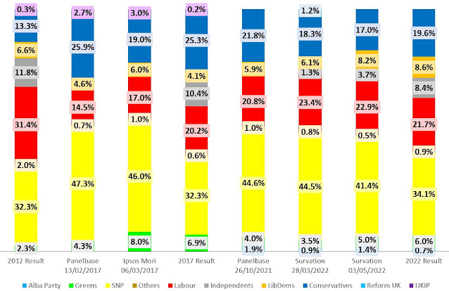 The big difference between Scotland and England is that Council elections in England still use First Past The Post, either in single-member wards or in multi-member wards. Like we did North Of The Wall before the Scottish Parliament switched it to Single Transferable Vote, a bastardised variant of proportional representation that brought chaos and backroom deals to Scottish Councils. What FPTP allows in England is a much clearer identification of each party's power base, ward by ward. This is what the parties will look at and map to assess their potential at a general election, constituency by constituency. This is where all the fun begins, as the new Council maps will certainly collide head-on with the 2019 Commons results in more constituencies than one. I expect a lot of that happening in the South, and probably mostly in the South West. And the most likely scenario is, as I said often earlier, Liberal Democrats bagging a majority of wards in constituencies where Labour came second to the Conservatives in 2019. I guess the council to watch this year will be North Somerset, where the Liberal Democrats and Labour will both want to prove they're the best placed to dislodge Liam Fox at the snap general. Unless an unexpected turn of events shifts national attention to Bracknell Forest in Berkshire, where a 'rogue progressive alliance' may prove its merits. Or not.