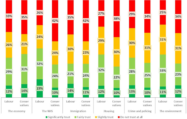 The voting intentions show a 13.6% swing from the Conservatives to Labour. This is higher than the swing found by generic polls in the North East and the North West, and similar to what they find in Yorkshire and the Humber. Redfield & Wilton use a list of fifteen topics for this line of questioning, and I have extracted the eight issues considered the most important by their panel, in descending order from left to right. Labour are leading on all issues, sometimes quite conclusively, and sometimes not quite so. There is definitely an odd mix here. On one side, ancestral left-wing working-class attitudes lead people to give Labour credit on issues that embody left-wing working-class priorities and values. On the other side, the recently infused right-wing approach leads quite a number of the same people to question Labour's credentials on items that are more related to traditional right-wing priorities. There are traces of this in the answers to another question, about the level of trust the panel have in the two major parties in the absolute, instead of relative to the other parties.