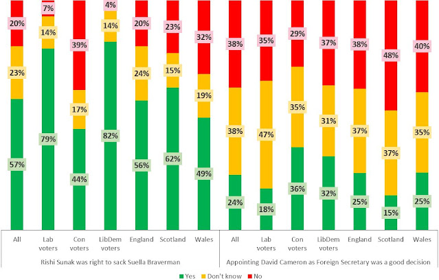 Rishi Sunak sacking Sue-Ellen Braverman was totally expected, as he should never have re-appointed her in the first place, after Liz Truss sacked her. Rishi Sunak bringing back David Cameron in one of the Great Offices Of The Empire was totally unexpected, and probably not the miracle cure to save his Premiership from complete disaster. Not to mention that bringing back the man who unleashed Brexit as Foreign Secretary looks like taking the piss out of pretty much everyone on the planet. I also wonder if Rishi Sunak realises that bringing back David Cameron is a clear admission that the Conservative talent poll has totally dried up. Not something you should want to make painfully obvious just months before a general election. Though there was a fun side to the whole fiasco, Sue-Ellen whining that Rishi had broken promises he made to her. What the fuck did she expect? It's the fucking Conservative Party, for fuck's sake. Or it might be Therese Coffey telling the media that she almost died from "ministerial stress", a very rare occurrence for someone who has done jack shit to the power of fuck all in all her time in government. YouGov, always ready to help, speed-polled the two main announcements in a matter of minutes. The Great British Public agree that sacking Sue-Ellen was the right decision, but are not really enthused by Call-Me-Dave now in charge of handling the two biggest international crises since VE-Day.